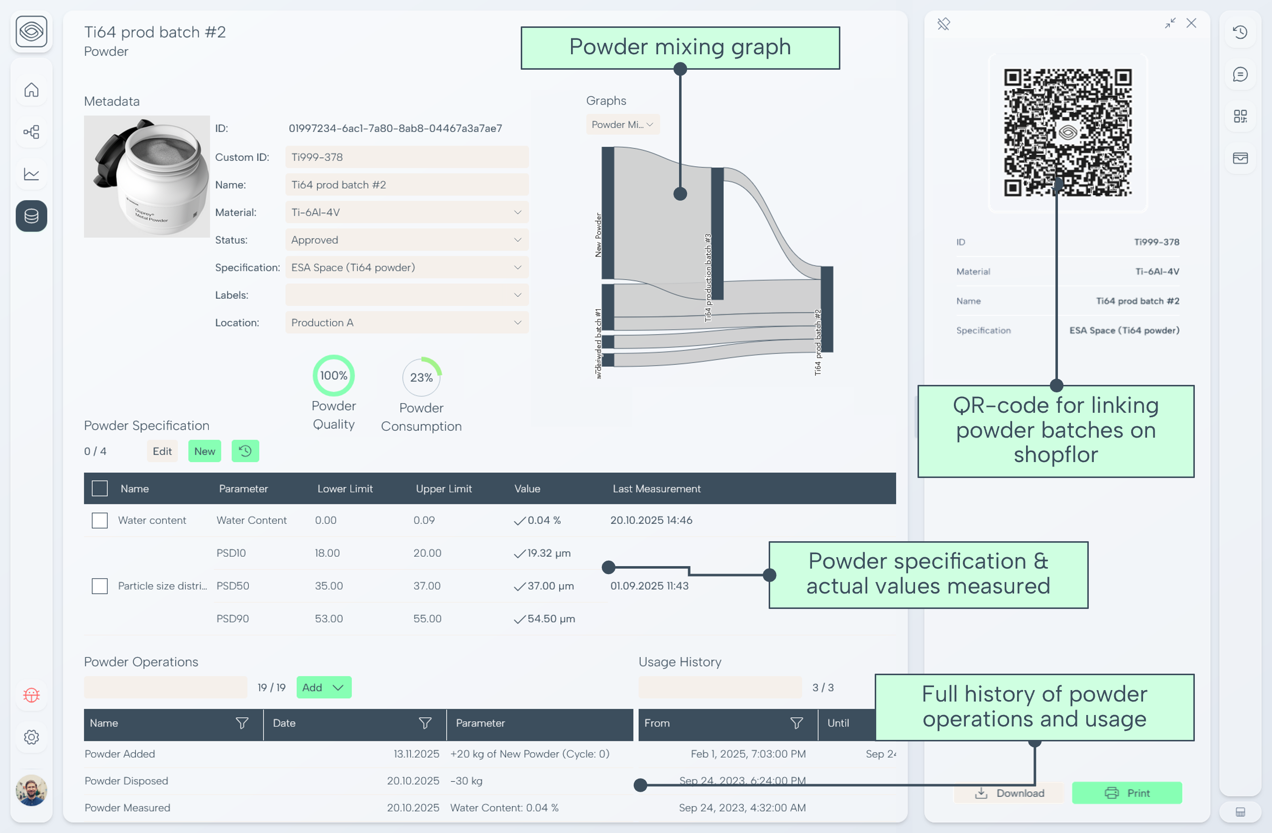 - Traceability, by making powder genealogy instantly available for audits and customer reviews