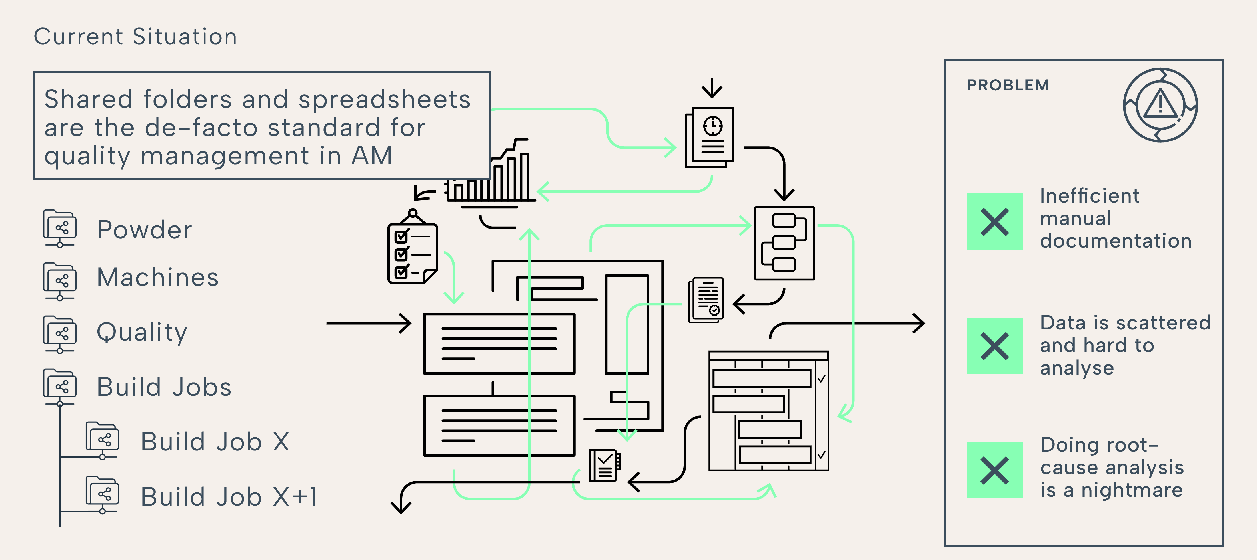Quality “lives” in Excel and shared folders. Build histories, inspection results, powder certificates, CT images, machine logs, all spread across different files and systems. When a customer or auditor asks, “Why did this happen?” the real work is hunting, copying and reconciling data before you can even start analysing it.